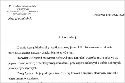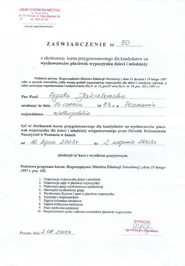 Jestem absolwentką Akademii Wychowania Fizycznego im. Eugeniusza Piaseckiego w Poznaniu. Swoją zawodową przygodę zaczynałam od dziedziny animacji dla dzieci i dorosłych, pracując w zagranicznych hotelach (głównie w Hiszpanii, ale również w Grecji, Turcji i Egipcie). Równocześnie, rozpoczęła się moja droga trenerska: poczynając od tańca latino i fitnessu, przez zdobycie uprawnień instruktora jogi, po stanie się trenerem medycznym. Wierzę, że zdobywana przeze mnie na przestrzeni lat wiedza i praktyka przyczyniają się skutecznie do osiągania oczekiwanych efektów przez moich klientów.